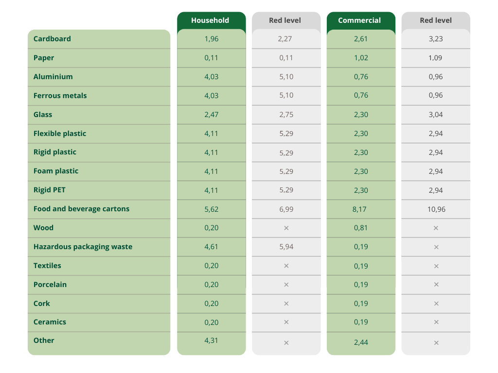 Emballageretur’s costs for handling (transport, sorting and treatment) of packaging waste by material category